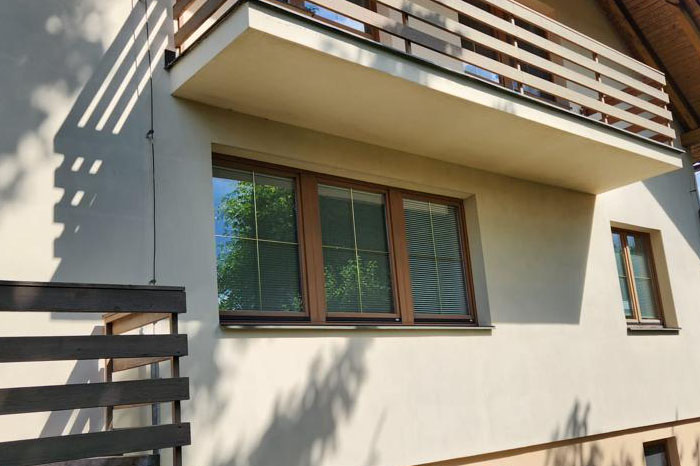 W ramach naszej realizacji w Czechach dostarczyliśmy aluminiową stolarkę okienną w eleganckim kolorze drewnopodobnym, idealnie dopasowanym do tradycyjnego charakteru budynku. Zastosowane złote szprosy nadają całości wyjątkowego uroku i podkreślają klasyczną stylistykę elewacji.