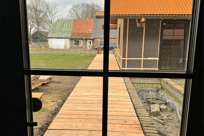 Prezentowane na zdjęciu aluminiowe okna, wykonane w systemie Aluprof, to realizacja zlokalizowana w Holandii, łącząca nowoczesną technologię z klasyczną estetyką dzięki zastosowaniu ozdobnych szprosów. Czarne, smukłe profile aluminiowe nadają konstrukcji elegancki i minimalistyczny charakter, a pionowe i poziome podziały szyb (szprosy) wprowadzają element stylu industrialnego lub loftowego.