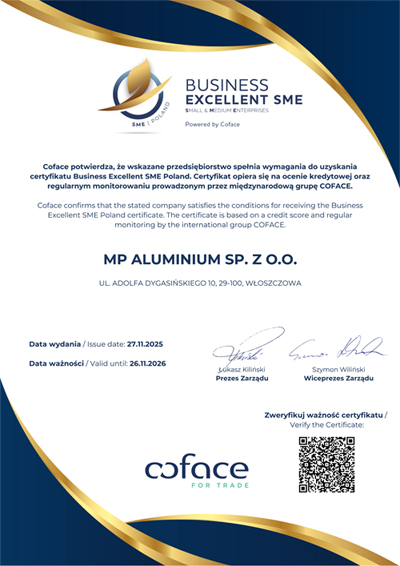 Z satysfakcją informujemy, że MP Aluminium Sp. z o.o. otrzymało prestiżowy certyfikat Business Excellent SME Poland, przyznawany przez międzynarodową grupę COFACE. Wyróżnienie to potwierdza wysoką wiarygodność finansową naszej firmy oraz pozytywne wyniki regularnego monitoringu prowadzonego przez niezależną instytucję o globalnym zasięgu.